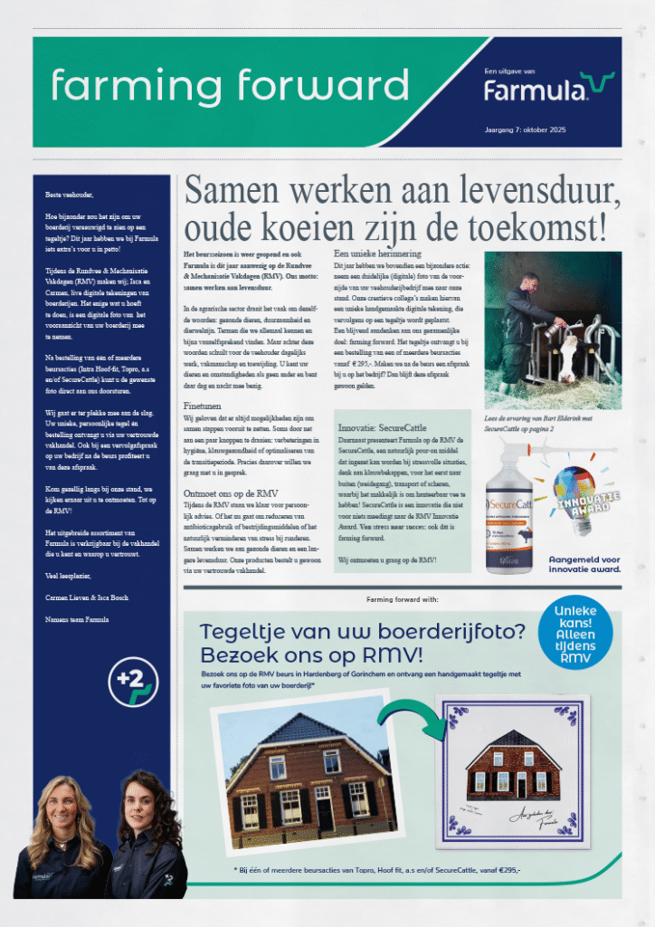 De Farming Forward krant verschijnt 4 keer per jaar en staat vol informatie over interessante thema’s, zoals levensduurverlenging, klauwgezondheid, benodigdheden en meer!