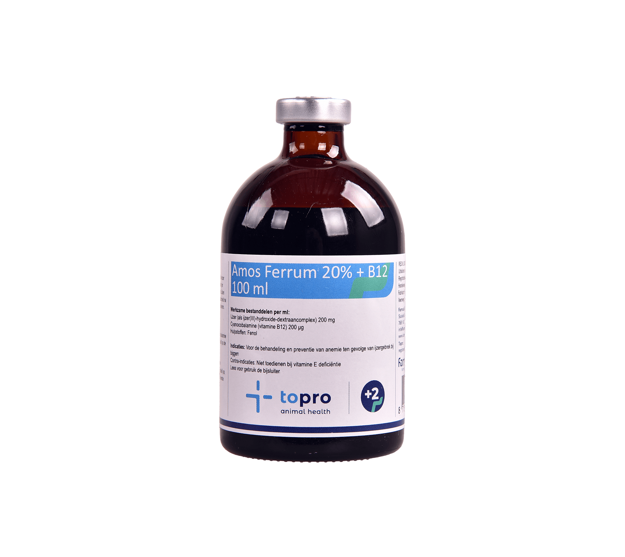 Topro Amos Ferrum B+ (voorheen Forte B+) is een oplossing voor injectie ter behandeling en preventie van anemie (bloedarmoede) ten gevolge van ijzergebrek bij biggen.