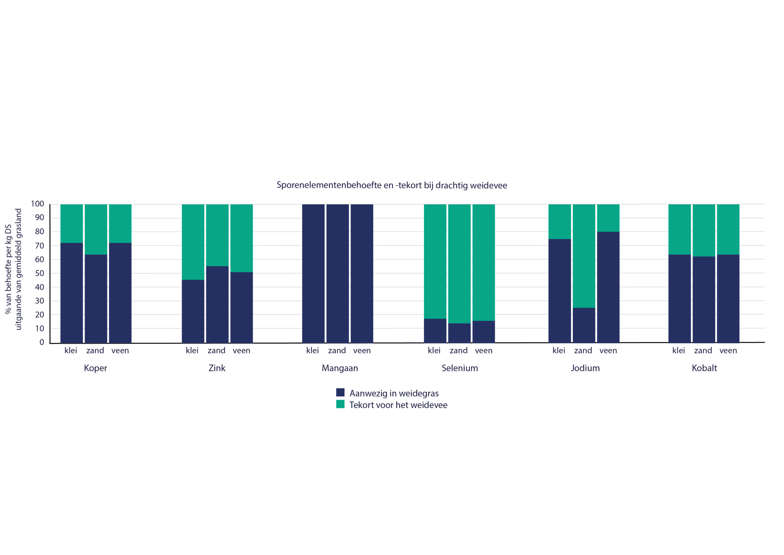 Weidegras bevat niet altijd genoeg sporenelementen. Vooral selenium, koper, zink, kobalt en jodium komen geregeld te laag uit, zie grafiek 1. Bovendien wisselen gehalten door grondsoort, snede en weer, en kan de opname geremd worden door antagonisten zoals molybdeen. Strengere bemestingsregels kunnen dit risico verder vergroten.